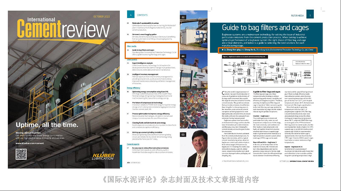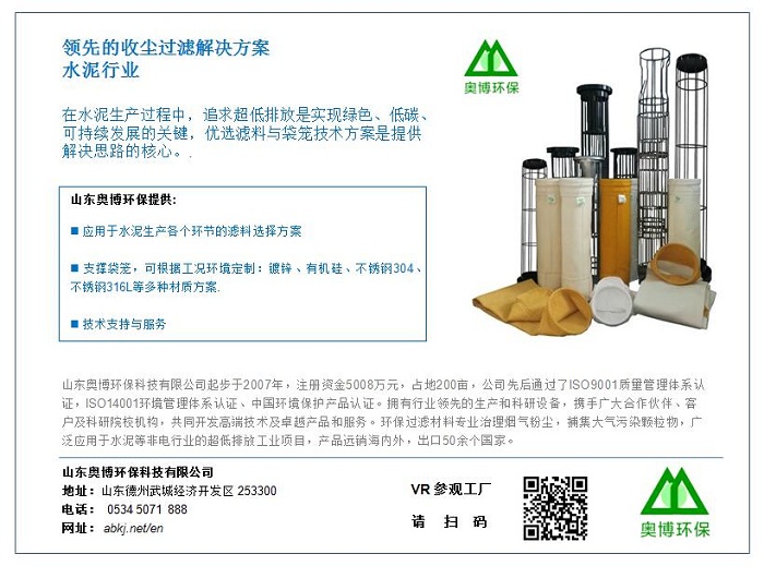 山東奧博環(huán)保公司提供的技術文章“水泥行業(yè)濾袋和袋籠選用指南”引起了國內(nèi)外水泥行業(yè)的關注,成功入選英國《國際水泥評論》雜志第10期,這是《國際水泥評論》本期期刊中唯一在列的中國技術文章。全球水泥行業(yè)最具權威性的主流媒體的肯定,意味著山東奧博環(huán)保的提供濾袋與袋籠技術進入新的高度,引領水泥收塵行業(yè)的過濾技術發(fā)展。
